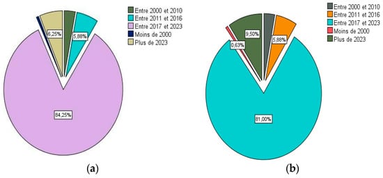 Figure 2a illustrates the distribution of engineers based on their graduation dates. The majority (84.25%) of degrees were earned recently, between 2017 and 2023, showing a significant rise in the number of graduates during this period. Engineers who graduated between 2011 and 2016 make up 6.25% of the sample, while those who graduated between 2000 and 2010 represent 5.88%. Graduates before 2000 are very few, and there are almost no graduates after 2023. These trends suggest a notable increase in engineering graduates, likely driven by rising demand for these skills or greater access to these educational programs.