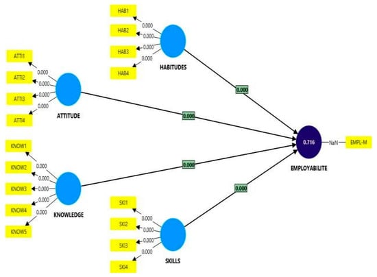 Figure 3 illustrates the measurement model, highlighting the relationships between the latent constructs—attitude, habits, knowledge, and skills—and the dependent variable, employability. All outer loadings are statistically significant (p < 0.001), indicating strong associations between the observed indicators and their respective constructs. Additionally, all path coefficients from the independent variables to employability are significant (p = 0.000), confirming the robustness of the structural relationships. The R² value of 0.716 suggests that the model explains 71.6% of the variance in employability, indicating substantial explanatory power.