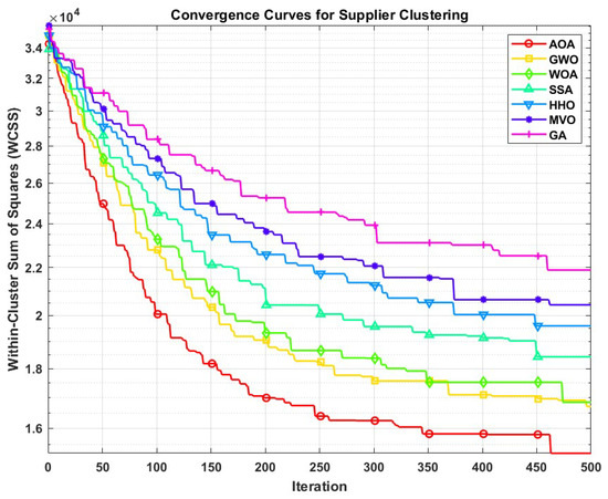Figure 1 illustrates the convergence behavior of the AOA compared to other algorithms on the supplier clustering problem. The convergence plots show the evolution of the Within-Cluster Sum of Squares (WCSS) over iterations.