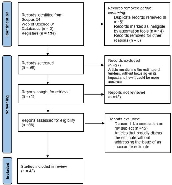 At the beginning, we found 135 articles related to these keywords, and by reading the summary, the introduction, and the results for all those articles, we reduced the number to 43 articles dealing directly with the use of artificial intelligence in editing the estimate of a public procurement act; those articles have been read and analyzed to come to the results mentioned at the end of this paper.