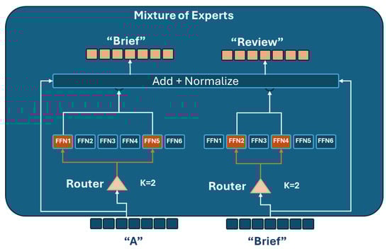 - Mixture-of-Experts (MoE): This approach extends the aforementioned architectures by activating only a subset of expert networks for each input token (see Figure 2). Notable models leveraging MoE include the following: