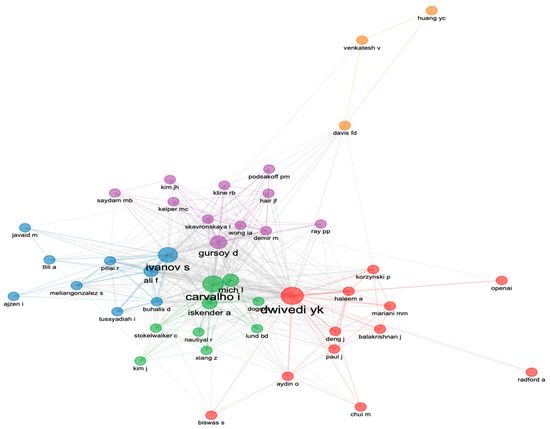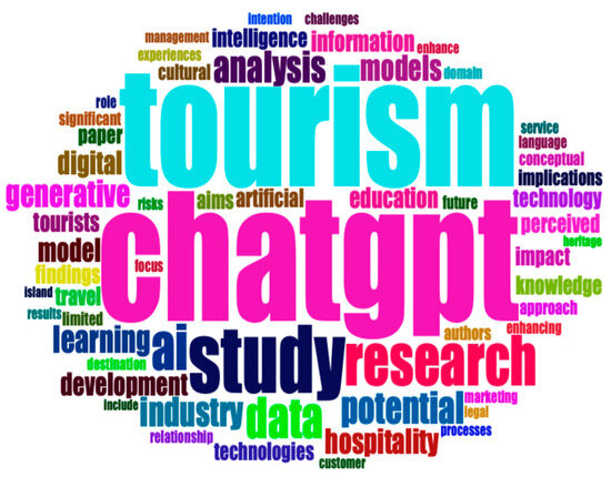 We conducted a co-word analysis to summarize the words used by the authors in their published documents. The authors presented concerns about ChatGPT and the tourism industry. We used ChatGPT, tourism, study, research, and AI as keywords as they were the most discussed. These keywords indicated that ChatGPT is a new technology for society, especially in the tourism industry. In addition, study and research are two keywords that the authors used to explore how ChatGPT contributed to the research. The authors discussed ChatGPT for future research or study directions [19,27,28,29,30] and revealed that generative AI such as ChatGPT contributed to studies on the tourism industry to understand the tourist acceptance of ChatGPT, perceived risks with respect to chatbots, and others. The overall word cloud of the articles is displayed in Figure 3.