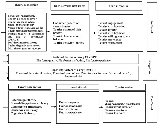 ChatGPT has been used in education [10], health [10], finance [11], multidiscipline fields [12], the environment [13], and the editorial and publishing fields [14,15]. ChatGPT is also used in the tourism industry to increase engagement, satisfaction, experience, and efficiency [16]. However, there are limited studies explaining how tourists’ behavior is predicted from a three-stage perspective using ChatGPT. Therefore, we explored documents published regarding ChatGPT to systemize the findings on the use of ChatGPT in the pre-, during, and post-travel periods. Tourist behavior was analyzed and predicted at three stages using ChatGPT.