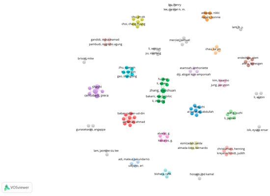 In total, 50 articles had co-authorship, and 174 authors were identified. By removing authors with zero citations and total link strength, 127 authors with a significant impact were identified. Figure 3 shows the annual publication trend, highlighting notable growth peaks in 2018 and 2023, with 9 articles published in 2023. Figure 4 visualizes a co-authorship network in cold chain management research. Each node represents an author, and different colors indicate 28 distinct groups selected based on collaboration frequency and research similarities. Larger nodes represent authors with more publications or greater influence, while thicker lines show stronger collaborative relationships. Figure 5 shows the nine authors with the strongest collaborative links from the first network. It highlights their tight-knit cooperation as a key figure driving research in cold chain management. The dense connections indicate this group’s significant impact on the field’s academic progress.
