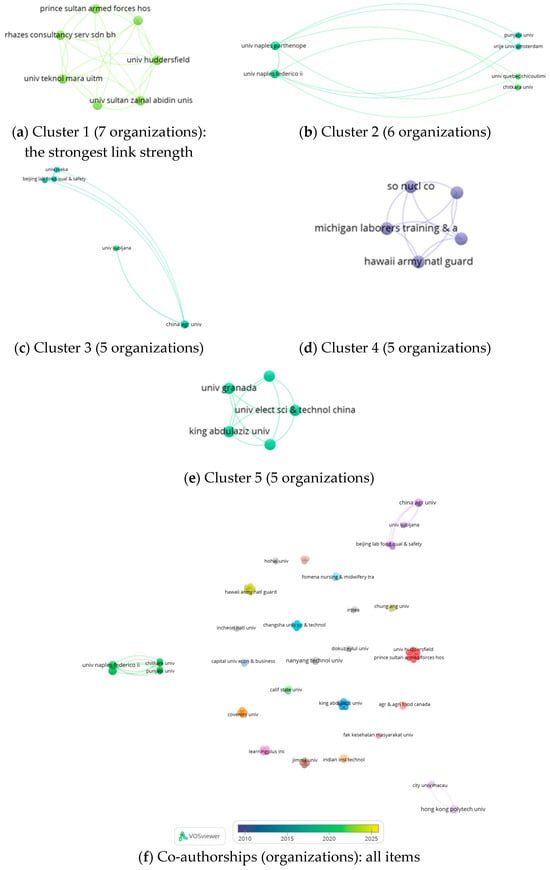 Co-authorship by organizations (79 items and five clusters of strong total link strength). (a) Cluster 1 (7 organizations): the strongest link strength, (b) Cluster 2 (6 organizations), (c) Cluster 3 (5 organizations), (d) Cluster 4 (5 organizations), (e) Cluster 5 (5 organizations) and (f) Co-authorships (organizations): all items.