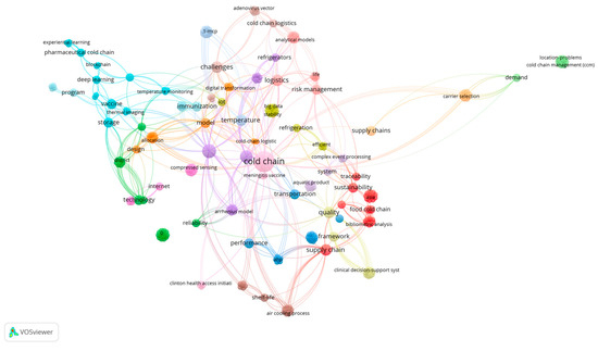 Co-occurrence analysis is used to examine the frequency of concepts appearing in the literature to identify emerging themes and research keywords. Lam and Tang [10] utilized this approach to explore the transformative impact of digital technologies such as IoT on traditional cold chains. This method reveals collaboration patterns through co-authorship analysis and tracks thematic developments via keyword co-occurrence [11,12,13,14,15,16]. Recent studies have further extended the use of co-occurrence analysis to address vaccine logistics and cold chain sustainability [17,18], disruptions in food supply chains during the COVID-19 pandemic [19], and consumer adoption behaviors relevant to technological innovations in logistics [20].
