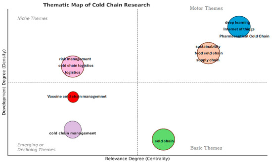 On the thematic map, cold chain logistics research keywords were grouped into four quadrants: motor themes (e.g., deep learning, IoT, and sustainability) for driving innovation and future advancements; basic themes (e.g., cold chain), which are foundational and central but less complex, supporting deeper exploration; niche themes (e.g., risk management), which are specialized and well-developed but with a limited impact; and emerging or declining themes (e.g., vaccine cold chain management), which are underdeveloped or declining, reflecting new opportunities or reduced interest. The result highlighted the strategic distribution of research areas, revealing driving forces, foundational concepts, and areas for potential growth.
