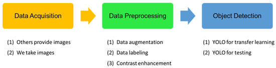 We used the YOLOv4 [10] object detection model to detect construction site safety nets. The detection process includes data acquisition, data preprocessing, and target detection (Figure 1). In the data acquisition stage, image data were compiled. Then, the images were augmented, labeled, and enhanced for image contrast. Object detection was applied in the YOLOv4 object detection model for transfer learning and testing its performance.