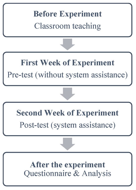 The experiment was conducted in two phases (Figure 2). Before the experiment, the professor explained the concepts to help students understand the basic structure and operating logic of the C language and have basic programming knowledge. The first test was conducted one week after the course began without using the visualization tool to evaluate students’ basic understanding of the content. The second test was conducted in the following week after using the developed tool. This allowed the students to use the system in programming tasks. After the experiment, students filled out a questionnaire on their experience with the tool and its learning effect.