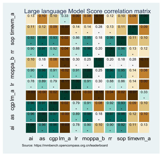 AS is an important measure of overall model performance. The correlation matrix showed that AS was highly correlated with MOP, RR, SOP, CGP, and AI, with correlation coefficients of higher than 0.90. Models with high average scores excelled in multiple areas, reflecting a well-rounded and robust performance profile. Interestingly, the high correlations with AS were not dependent on whether the model included a visual or language component. The overall performance of an LLM was influenced by a combination of factors, and the presence of specific components (visual or language) did not ensure excellent performance. Instead, these components and the model’s ability were integrated to process diverse types of information showing superior performance.