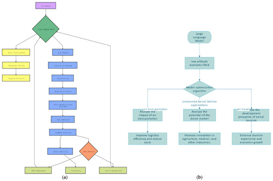 Recently, the development of AI has brought about significant changes across various industries, particularly in the low-altitude economy. A wide range of applications are used from unmanned aerial vehicles (UAVs) to air transportation and tourism, all of which have been advanced due to the integration of LLMs (Figure 3b). LLMs are characterized by their ability to process vast amounts of text data and generate human-like responses being indispensable tools in many sectors. Their applications extend beyond traditional domains, finding innovative uses in emerging technologies such as those within the low-altitude economy.