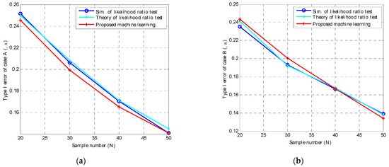 Figure 1a,b present the type I error plotted against the sample number, N, of the proposed ML based on the CNN, as well as the theoretical and simulation results of the likelihood ratio test for cases A and B, respectively. All performances produced similar results. This confirms that the proposed CNN performed similarly to the conventional optimum likelihood ratio test. Notably, similar results were observed for the type II error, which is omitted here.
