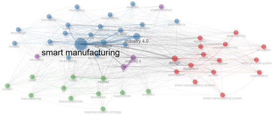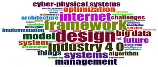 The “Word Cloud Analysis” chart displayed common keywords in research. “Framework”, “design”, “model”, and “Industry 4.0” were the important topics concerning the implementation of Industry 4.0. “Cyber-physical systems”, “Internet of Things”, and “big data” indicate trends in technological advancements and data analysis, which increasingly impact modern manufacturing and management systems. Such results showed the primary and future research areas (Figure 5).