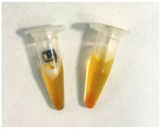 The components were selected for their easy availability and safety. The phantom was fabricated using only four components, highlighting its simplicity and accessibility. Four components were used: PBS solution (Sigma-Aldrich, USA), an aspirin tablet (Bayer, Germany), citric acid (Sigma-Aldrich, USA), and a tea infusion (Mokate, Poland) [16]. This allowed a phantom to be reproduced quickly and cheaply in any laboratory, without the need for complex procedures. The resulting product of combining the above components is shown in Figure 1. The order in which the ingredients were added was not important. The proportions and concentrations of the individual components were crucial. The developed phantom exhibited a color and appearance that closely mimicked that of natural urine, making it suitable for visual and spectroscopic studies requiring realistic substitutes.