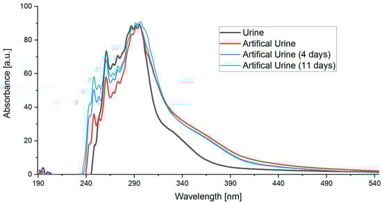 For absorbance measurement, we used a Nanodrop One C (Thermo Fisher Scientific Inc., Waltham, MA, USA) spectrometer. The wavelength range was 190–850 nm with a photometric accuracy of 3% at 302 nm. The bandwidth was ≤1.8 nm. The measuring device was used to detect materials at low concentrations. A sample volume of 2 µL was used for each measurement. All measurements were conducted at room temperature. For the measurements, urine from a patient and artificially produced urine were used. After the measurements, the obtained spectra were compared by checking the coincidence of the peaks (Figure 2).