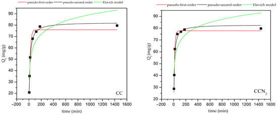 Fitted kinetic models for methylene blue adsorption onto CC and CCN2 samples.