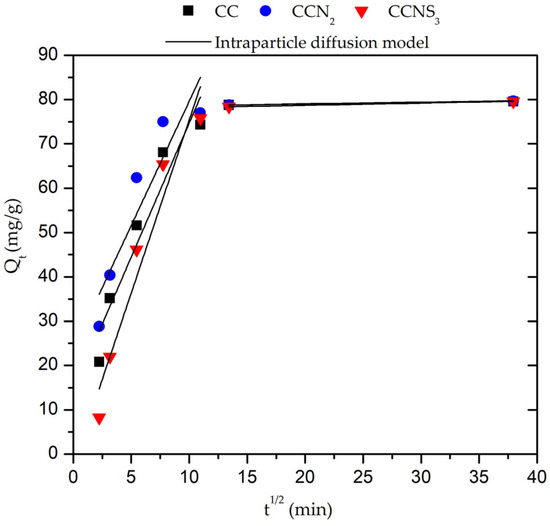 In the first hour, adsorption was fastest for all samples; after two hours, adsorption slowed down and an equilibrium state was reached for all three samples. After three hours of adsorption, the methylene blue is adsorbed almost completely, for all samples, and the percent of adsorption is >98.5%. The calculated kinetic parameters are presented in Table 1 and Table 2. For the linear pseudo-first-order model, the constant rate was calculated from the slope and intercept ln (qe-qt) versus t graphs, while for the linear pseudo-second-order model, the constant rate was calculated from t/qt versus t graphs. Based on the calculated correlation coefficient, it can be concluded that the linear pseudo-second-order model fits excellently for all samples. In addition, the non-linear pseudo-second-order and both pseudo-first models, linear and non-linear, fit well for all samples (R2 > 0.97). The lower correlation coefficient for the Elovich model (R2 < 0.80) indicates that this model does not fit well for these samples. Calculated from the pseudo-second-order model, the constant rate k2 is the highest for the CCN2 sample, which means that methylene blue is first adsorbed on the CCN2 sample surface. On the other hand, the k2 constant rate is lowest for the CCNS3 sample, which can be explained by the higher microporosity of this sample and the more difficult adsorption of the methylene blue molecule. The higher value of the Elovich constant α, compared to the pristine and CCNS3 samples, also indicates and confirms the higher adsorption rate and fastest adsorption of methylene blue for the CCN2 sample. Equations of the used kinetic models are presented in Table 1 [4,6,7].