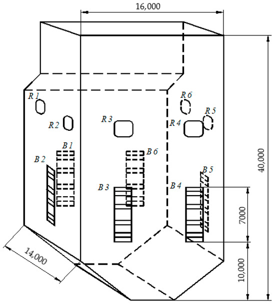 The dry-bottom furnace of the boiler is tangentially fired by pulverized coal. The furnace dimensions, the location of the burners, and the location and dimensions of recirculation openings are shown in Figure 2. The furnace is equipped with six burner assemblies (B1–B6), each of which is connected to one fan mill and one recirculation opening (R1–R6). Each burner assembly contains four tiers (one air—dust duct with two ducts of secondary air around it) of the straight-flow burners. The dimensions and arrangement of the burner are shown in Figure 2. Each burner is composed of four stages, each of which contains a coal nozzle and two nozzles for secondary air injection. The pulverized coal—primary air mixture enters the furnace through the coal nozzle at 438.0 K. Secondary air is heated up to 543.0 K. At nominal-load operating conditions, five burners are in operation (B6 and R6 are stand-by).
