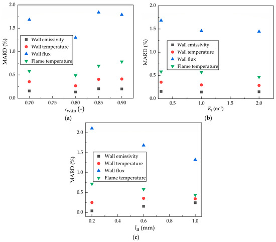 The MARD values for the initial values of surface emissivity, total extinction coefficient, and ash deposit layer thicknesses are shown in Figure 3a–c. In all diagrams, the MARD is the smallest for surface emissivity, then wall temperature, flame temperature, and wall fluxes. The highest MARD slightly exceeds 2.0%. The MARD was approximately constant for the various initial surface emissivities and total extinction coefficients. With the increase in deposit thickness, the MARD decreases for wall flux and flame temperature and increases for wall temperature and wall emissivity.