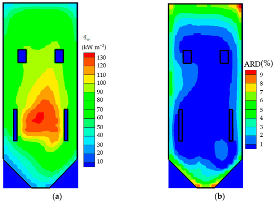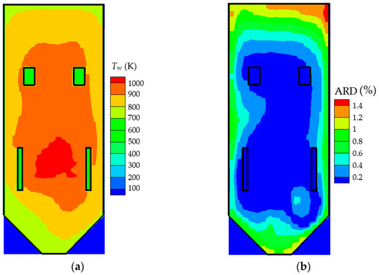 The flame temperature and its ARDs are shown in Figure 7a,b. The flame temperature is the highest near the burners, because of the rapid heat release from combustion. In the other parts of the furnace, the flame temperature decreases because of the radiative heat exchange with the furnace walls. The values of the ARDs are also lowest in the parts of the furnace where the temperature levels are not the highest.