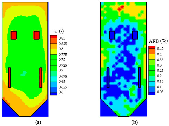 The wall emissivity and the corresponding ARDs for the same wall are shown in Figure 6a,b. The wall emissivities are the lowest in the areas where the wall fluxes are the highest, according to the dependence of emissivity on temperature. The values of the ARDs are lower than those for wall fluxes and temperatures, in accordance with the smallest values of the MARD, shown in Figure 3.
