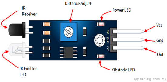 The IR sensor module consists mainly of an IR Transmitter and Receiver, OPamp, Variable Resistor (Trimmer pot), and LED outlet. IR LED Transmitter: IR LED emits light, in a wide infrared frequency. IR light is not visible to humans as its wavelength (700 nm–1 mm) is much higher than the visible light intensity. IR LEDs have an optical illuminating angle of approximately 20–60 degrees, and range of approximately a few inches to several feet, depending on the type of IR transmitter and the manufacturer. Some transmitters operate with a range of several miles. An IR LED is white or transparent in color, so it can provide high light intensity. Photodiode Receiver: the photodiode acts as an IR receiver as it operates when light falls on it. A photodiode is a semiconductor with a P-N junction, which operates in Reverse Bias, which means it initiates current in reverse direction when light drops in it, and the current flow value is equal to the amount of Light. This feature makes it useful for IR detection. A photodiode looks like an LED, with a black color on its outer surface; the black color absorbs a very high amount of light shown in