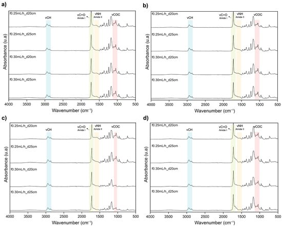 On the other hand, in Figure 2b–d, the characteristic absorption bands of sericin were evidenced, where amide I (1670–1690 cm−1), amide II (1552–1570 cm−1) and amide III (1240–1250 cm−1) are found. These bands correspond with the stretching C=O, N-H and C-N, which coincides with the characteristic peaks of a random coil structure. Similarly, the presence of the C-H and O-H bending vibrations in the band of 1390–1394 cm−1 and the C-OH stretching vibration between 1064 and 1070 cm−1 is denoted [,,].