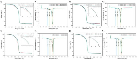 Thermograms of TGA and derivate thermogravimetry (DTG) of membranes (a) TGA of PCL/Ch, (b) DTG of PCL/Ch, (c) TGA of PCL/Ch/SS_1%, (d) DTG of PCL/Ch/SS_1% (e) TGA of PCL/Ch/SS_1.5%, (f) DTG of PCL/Ch/SS_1.5%, (g) TGA of PCL/Ch/SS_2% and (h) DTG of PCL/Ch/SS_2%.
