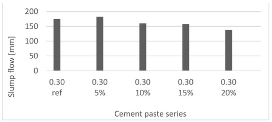 The results of slump flow values obtained for the respective cement paste mixes have been presented in Figure 2. It may be seen that the slump flow of the investigated mixes generally tends to decrease with the increase in cement substitution level. However, the 0.30 5% mix reveals the highest slump flow of all investigated mixes, i.e., 182.5 mm.