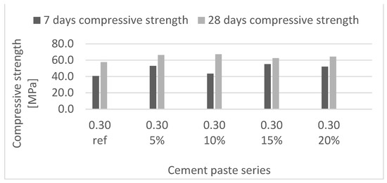 The results of 7- and 28-day compressive strength (CS) values obtained for the cement paste samples have been presented in Figure 3. Accordingly, the CS of each cement paste with the addition of the spent catalyst was found to be higher in comparison with the 0.30 ref sample, both at the 7th and 28th day of hydration. The highest 7- and 28-day CS values were measured for 0.30 15% and 0.30 10% sample, respectively, exceeding the CS of 0.30 ref for 36% and 17%, respectively. As expected, the CS enhances with the curing age.