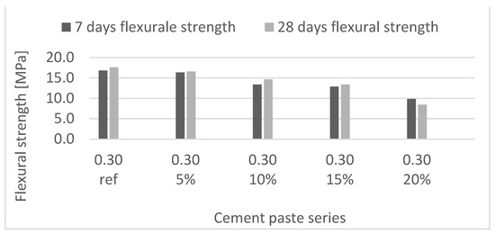 The results of 7- and 28-day flexural strength (FS) values obtained for the respective cement paste samples have been presented in Figure 4. Accordingly, the FS tends to decrease with the increase in cement substitution level, mentioning that the FS of the respective samples is generally similar between the 7th and 28th day of hydration.