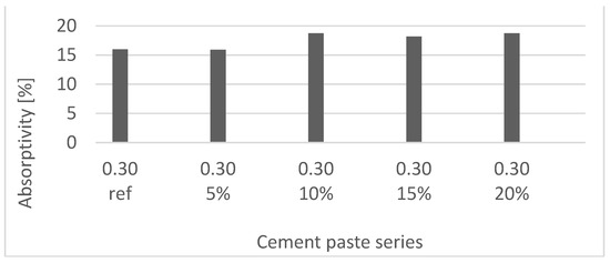 The results of water absorptivity values obtained for the respective cement paste samples have been presented in Figure 5. Considering the results, it might be stated that the water absorptivity of 0.30 5% is similar to 0.30 ref. However, as 10% and more of cement is substituted with spent catalyst, the water absorptivity increases. The values obtained for 0.30 10%, 0.30 15% and 0.30 20% are also similar to each other, nonetheless, exceeding 0.30 ref for 17%, 14% and 17%, respectively.