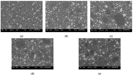 The microstructures of the cement paste samples have been presented in Figure 6 in the form of SEM images at ×200 magnification. On the basis of the greyscale of the images, the components and pores were identified. The light grey shapes correspond to the unhydrated cement grains, whilst the coarser spherical shapes in darker color are attributed to unreacted spent catalyst particles. Accordingly, the pores, which might be seen as a black pixels, are mainly identified in the interphase transition zone (ITZ) between spent catalyst and CSH gel. Therefore, their content was found to increase with the increasing cement substitution level. As such, the matrix of the 0.30 ref was found to the be more homogenous and uncracked when compared to those matrices of the samples with spent catalyst addition.
