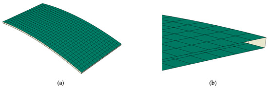 Numerical model of the curved IGU: (a) Finite element mesh; (b) Detail of the glass–spacer interface. Note: glass panes are shown in green, while spacers are grey.