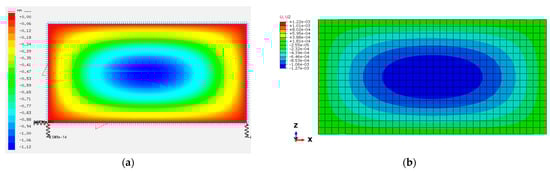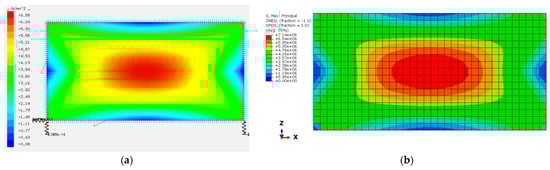 Validation of the flat IGU model (‘summer’ load case): (a) deflections obtained from the SJ-Mepla software (values in mm); (b) deflections obtained from the ABAQUS software (values in m).