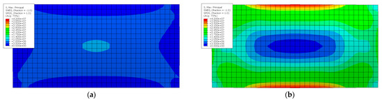 Validation of the flat IGU model (‘summer’ load case): (a) maximum principal (tensile) stress obtained from the SJ-Mepla software (values in MPa); (b) maximum principal (tensile) stress obtained from the ABAQUS software (values in Pa).