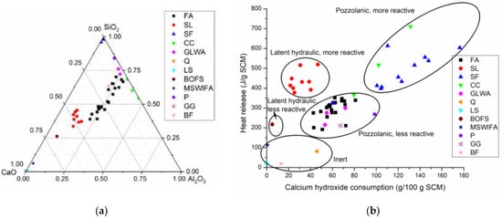 Characteristic of various SCMs: (a) ternary phase diagram showing SiO2, Al2O3, and CaO amounts for various SCMs []; (b) results from isothermal calorimetry and thermogravimetry analysis on various types of SCMs and their classification. Key to SCM types: fly ash (FA), ground granulated blast furnace slag (SL), silica fume (SF), calcinated clay (CC), ground lightweight aggregates (GLWA), quartz (Q), ground limestone (LS), basic oxygen furnace slag (BOFS), municipal solid waste incineration fly ash (MSWIFA), ground pumice (P), ground glass (GG), and basalt fines (BF) [].