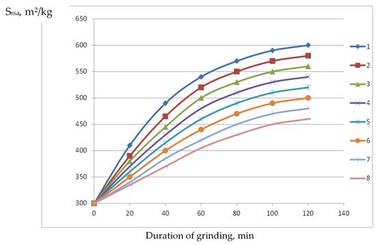 The influence of additives on the specific surface area of CC at different durations of grinding. 1—PG—0.04%, Sika VC 225—0.5%; 2—PG—0.04%; 3—PG—0.02%, Sika VC 225—0.5%; 4—PG—0.02%; 5—SP-1—0.5%, PG—0.04%; 6—SP-1—0.5%; 7—Sika VC 225—0.5%; 8—without additives.