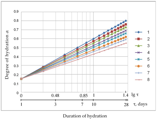 The influence of the hydration duration on the degree of hydration of composite cements (α) (line numbering is given for cements according to Figure 1).