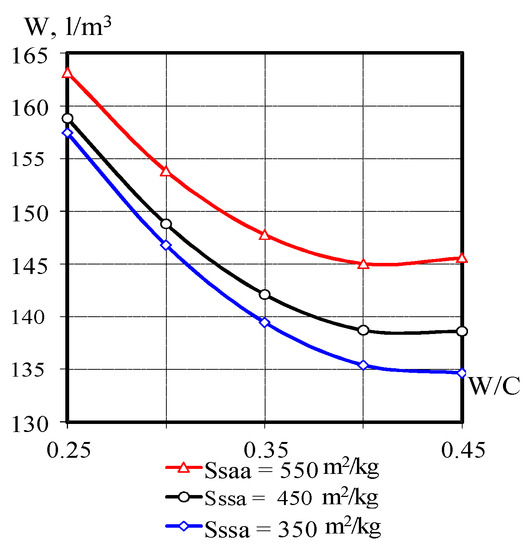 When analyzing models of water consumption of a concrete mixture (Figure 3 and Figure 4), attention is drawn to the practically identical values of water consumption of a concrete mixture in the interval W/C = 0.45 − 0.35 and its significant increase at W/C < 0.35. this confirms the well-known [1] rule of water consumption constancy at W/C < W/Ccritical. At the same time, the results of the study show that the polycarboxylate superplasticizers addition makes it possible to shift the critical value W/Ccritical towards lower values. For concrete without superplasticizers, it is usually in the range of 0.43–0.4 [28]. The water demand model also reflects the increase in the concrete mixture water demand as the specific surface area of the cement increases.