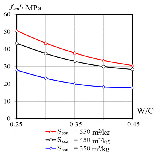 Analysis of the strength mathematical models (Figure 5, Figure 6 and Figure 7) shows the unconditional leading value of the factors W/C and Sssa. The influence of the specific surface area of the CC increases significantly for the one-day strength of the concrete. With increased values of Spyt, the effect of increasing W/C on the early strength of concrete becomes less significant (Figure 5).