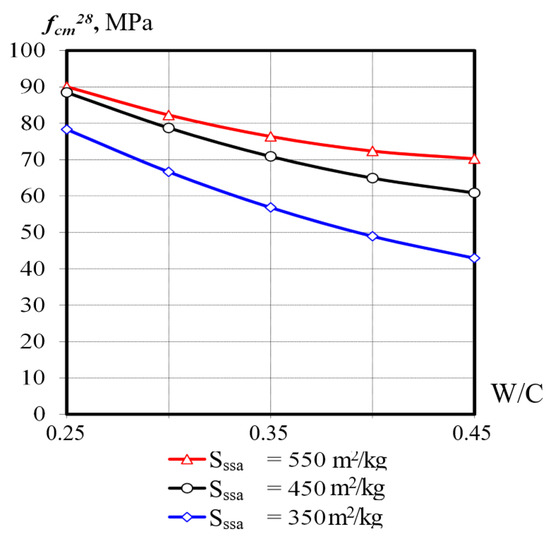 The influence of W/C and specific surface area on the concrete compressive strength at 28 days (PFM1 = 0.7).