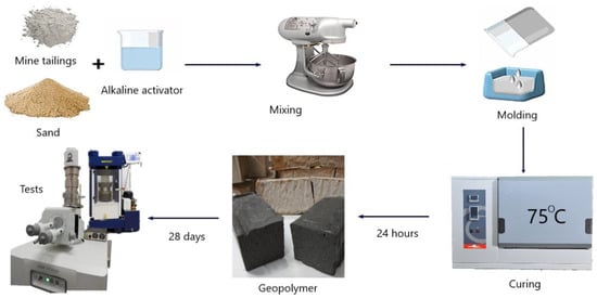 Geopolymers are a class of synthetic inorganic aluminosilicate materials, usually formed as a result of the reaction of aluminosilicates (e.g., fly ash or metakaolin) with a solution of silicates under usually strongly alkaline or sometimes acidic conditions [,]. Their synthesis has been estimated to emit about five–six times less carbon dioxide than the production of Portland cement and needs significantly less energy for the manufacturing process [,], but it is not only the advantages of geopolymer materials that take into account the circular economy approach. One of the most important benefits is the possibility of using waste for production [,]. One of the most promising opportunities is mine tailings [,]. These types of wastes are reachable in aluminosilicate, which is a main component of the geopolymerization process [,].