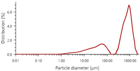 The mean size of the particle is about 600 µm. In comparison to the other raw materials used in the geopolymerization process, such as metakaolin or fly ash, this particle size is quite large []. It should be noted that research shows that decreasing the particle size can positively influence the material reactivity [], but at the same time increase the energy consumption for the whole process.