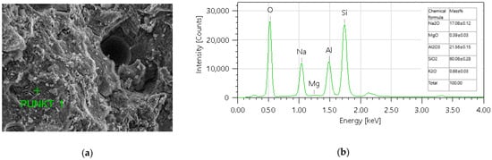 The oxide composition obtained as a result of EDS measurements is typical for a geopolymer material. It is characterized by a large amount of SiO2, about 60%, and Al2O3 of more than 21% [,]. Another important compound, Na2O at 17%, probably comes from the alkali activation process. There are also small amounts of MgO and K2O (less than 1%), in the structure.