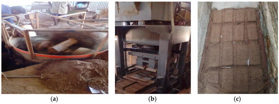 Different proportions of raw materials were used to make bricks, as shown in Table 2. The collected waste materials, cement, and water were mixed using a pan mixer until a consistent mixture was obtained. It was noted that to maintain the same amount of mixture consistency, for each trial, the amount of added water was 3 to 4 liters for a weight of 21 kg, and the amount of water used in each trial varied depending on the materials used. A conveyor belt was used to transport the mixed materials to the compression system for compacting, and bricks were cast using a hydraulic pressing machine with a 2200 psi pressure. The amount of compression that one brick was subjected to varied depending on the size of the materials. A total of 120 bricks (24 in each mixing ratio) were produced, each brick weighing approximately 3.5 kg. The produced bricks were taken and stacked for curing for 21 days to ensure a high-quality product [16]. A plastic sheet was laid in an area close to the brick-making unit and was covered immediately with a jute sack to prevent the bricks from drying too quickly. They were watered once every day for seven days, and to ensure a well-cured brick, they were left under plastic for eleven days [12]. Figure 2 depicts the specimen preparation process.