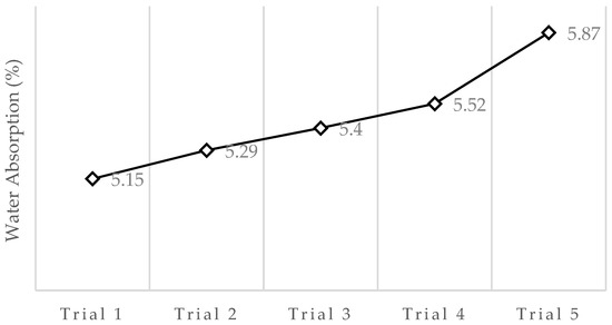 Figure 3 shows the average water absorption results for brick in each mixed ratio. According to the protocol outlined in IS [27], the bricks must absorb no more than 20% of their weight in water after 24 h of immersion in cold water. Figure 3 shows that the water absorption values for bricks were less than 7% in each trial, meeting the IS requirements [27]. A lower rate of water absorption was observed in trail 1 with the increase in the percentage of quarry dust.