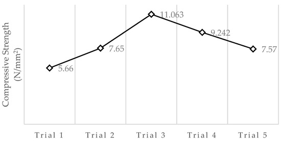 The compression test machine measured the dry compressive strength of brick samples. Three random samples were taken from each mixed ratio, as in the water absorption test. The sample’s face was subjected to a compression load with dimensions of 230 mm × 110 mm. The compressive strength was determined by dividing the overall load by the original cross-sectional area of the specimen. Figure 4 shows the compression strength test arrangement, and the average compressive strength results are displayed in Figure 5. From Figure 5, it was observed that the composition used in trial 3 achieved the highest compressive strength compared with other compositions used in other trials. However, the compressive brick strength results ranged from 7 to 14 N/mm2, which could be classified as Grade A [28].