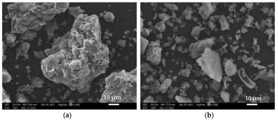 The analyzed diatomite dust was characterized by the presence of phases such as silicon oxide, kaolinite, albite, and aluminum oxide. Similar phases were obtained in the investigations by Ediz et al. and Ren et al. [,]. As a result of the calcination of diatomite, the percentage of albite increased to about 30%, while the percentage of kaolinite decreased to about 31%. In addition, in the calcined diatomite dust, the percentage of the silicon oxide phase increased to almost 38%. The non-calcined diatomite dust had a higher percentage of phases, such as kaolinite (about 49%) and aluminum oxide (0.5%), in its phase composition, compared to calcined diatomite dust.