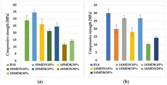 For geopolymers activated with 14 molar alkali solution, the highest compressive strength value was obtained for sample R14 (reference material)—almost 30 MPa. The lowest value was obtained for the 14MDN30% material—about 11 MPa. The values of the average compressive strength for samples 14MDN10% and 14MDN15% oscillate at a similar level—about 20 MPa. The addition of 30% calcined diatomite (14MDK30%) caused a decrease in compressive strength by almost 50% compared to the reference sample (R14). The highest mean standard deviation, which remained similar, was recorded for the reference material (R14) and the 14MDN15% material. On the other hand, the smallest was for 14MDN30% and 14MDK30%.